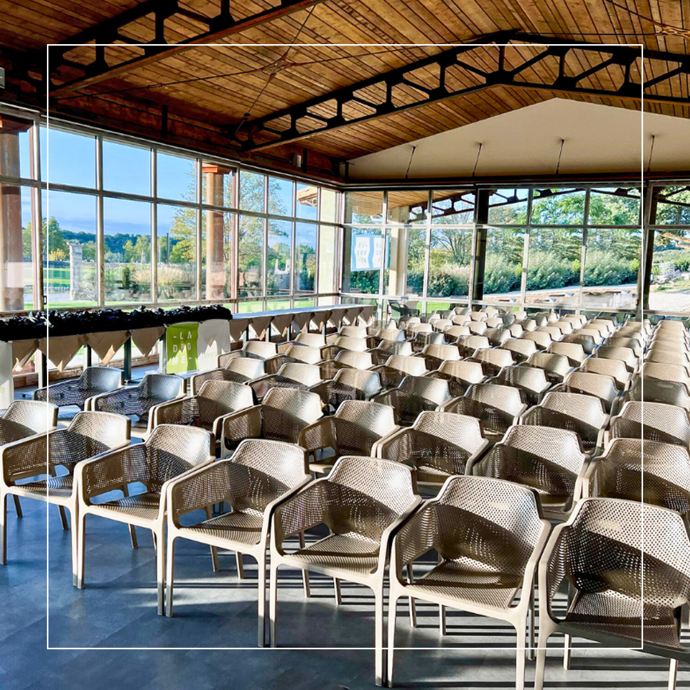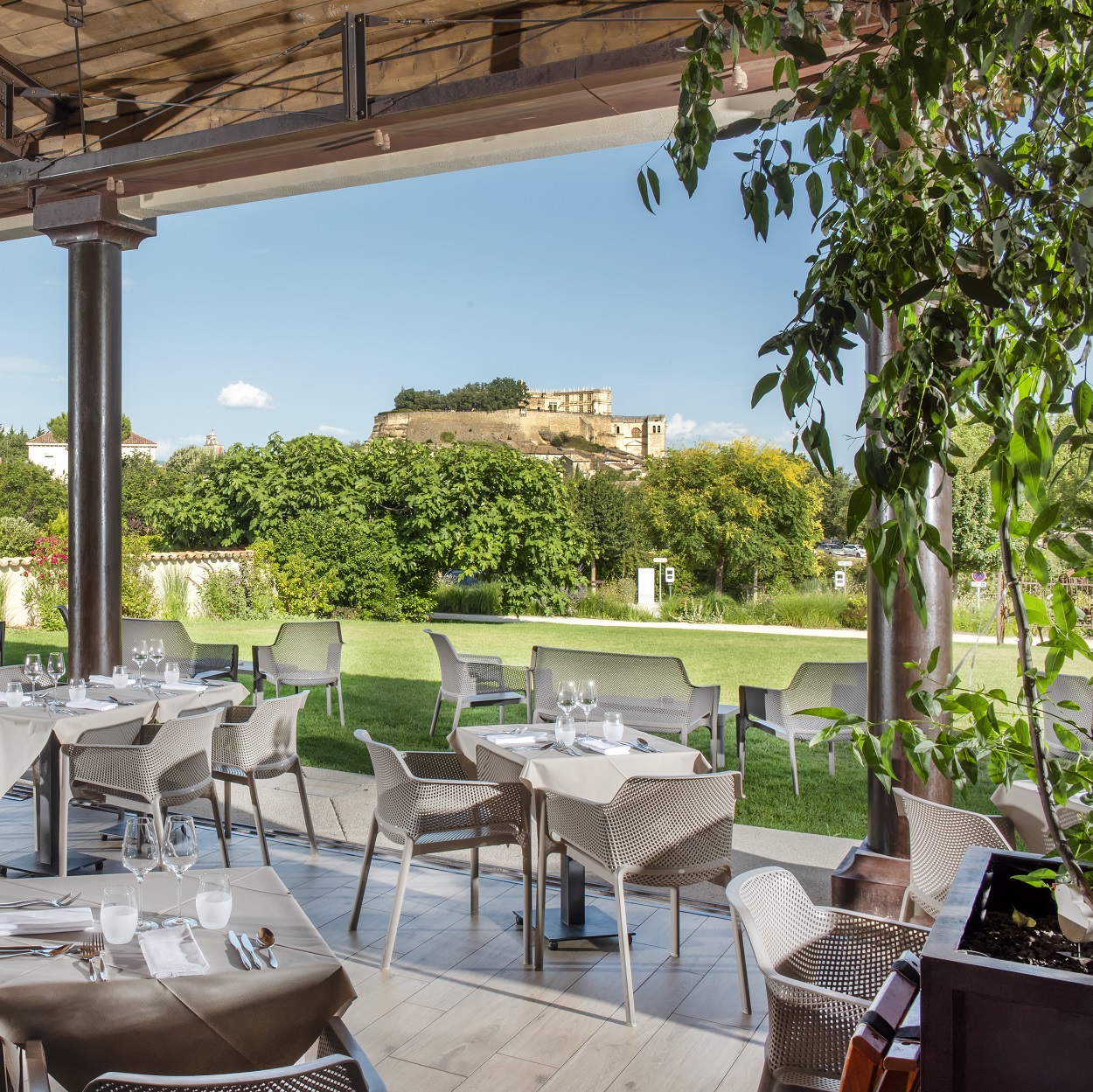 Our largest room, the 200 m² veranda overlooking the Château de Grignan, can be fully opened or closed depending on the weather, and can accommodate up to 190 people in theater.