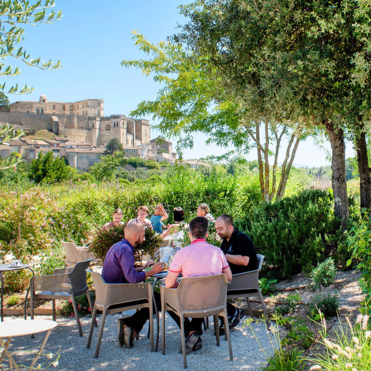 Le Jardin Méditerranéen privatized for your event. A haven of serenity opposite the Château de Grignan, where lavender, olive trees and aromatic plants enhance the elegance of Drôme’s heritage. Several options are available: brazier evening under the stars, sit-down meal, buffet dinner… in a warm and authentic Provencal atmosphere.
