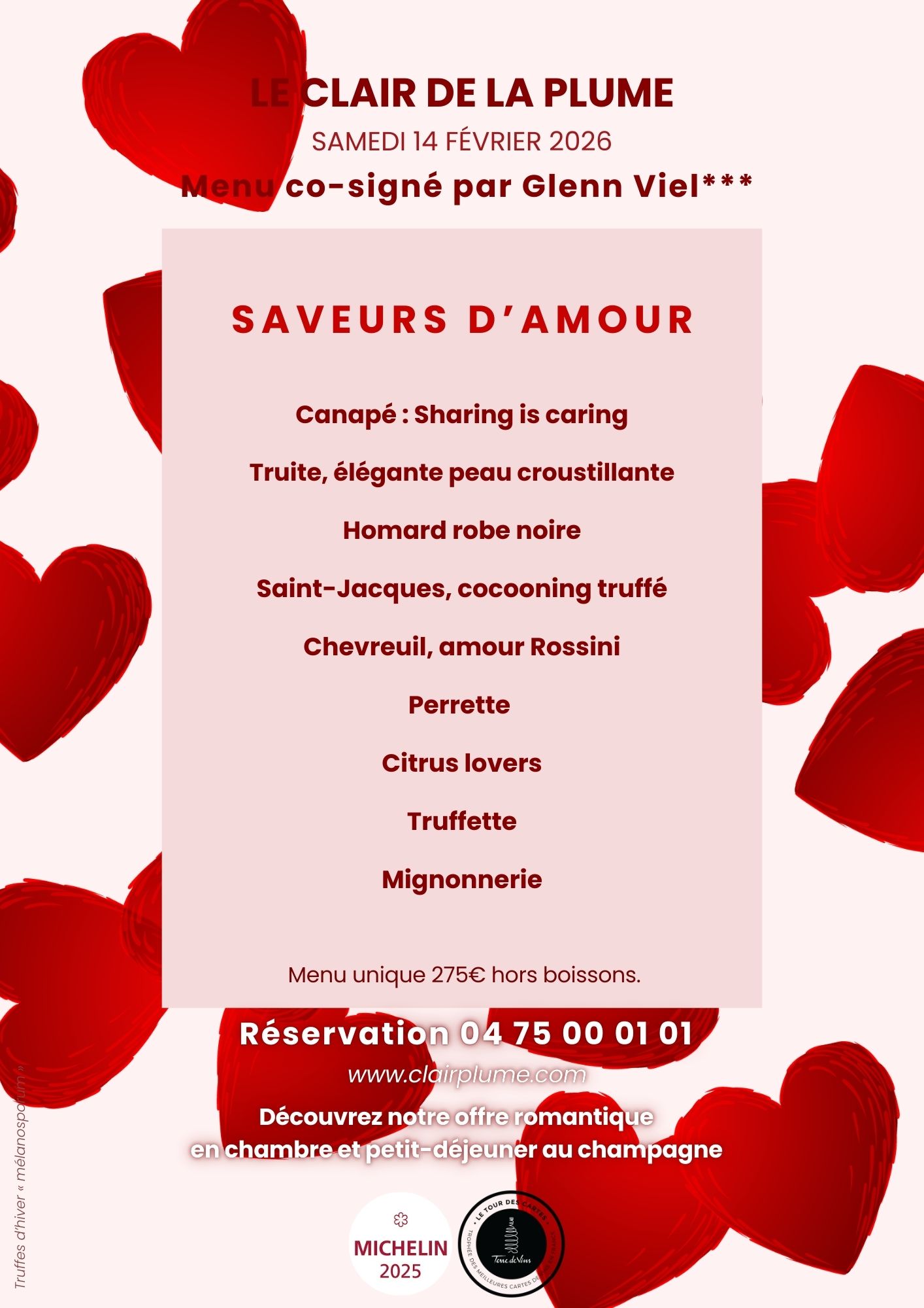 Truite, élégante peau croustillante Homard robe noire Saint Jacques, cocooning truffé Chevreuil, amour Rossini Perrette Citrus lovers Truffette Mignonnerie Menu unique 275€ hors boissons |